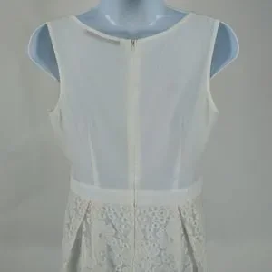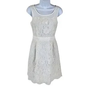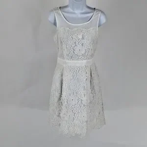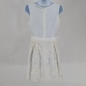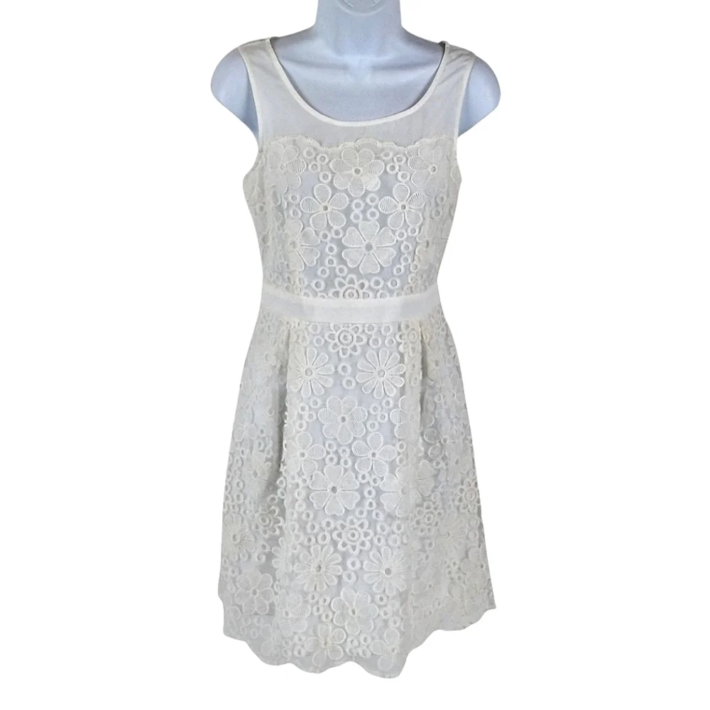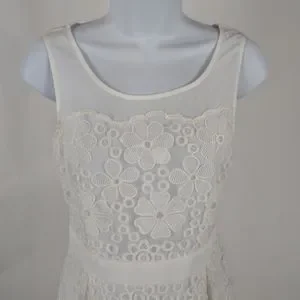 White dress is semi sheer fabric with floral embroidered design.