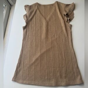 Soft and lightweight ribbed knit top in a neutral tan/beige color. Features a flattering V-neckline with three front buttons and delicate ruffle cap sleeves for a feminine touch. Fitted silhouette that looks great tucked in or worn out perfect for layering or wearing on its own.