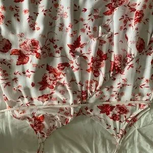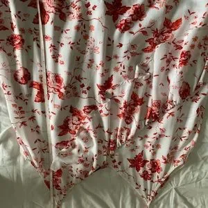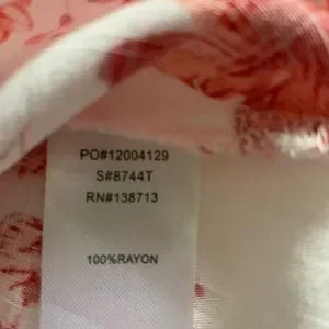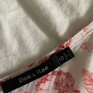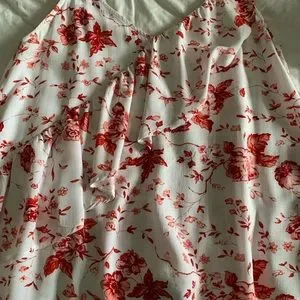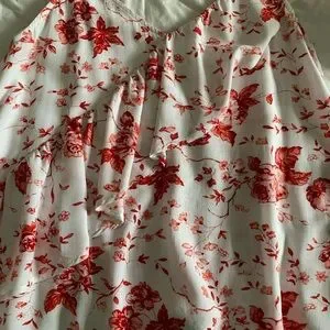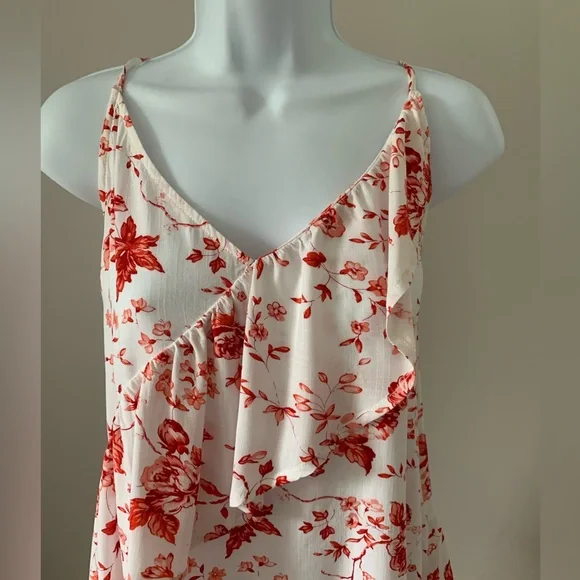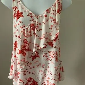 Doe&Rae tank top. Size small tank has a pit to pit of 17 1/2” and a length of 23”. Tank is 100% Rayon. Tank has a fun asymmetrical ruffle on the front. Nice floral in a reddish orange color.