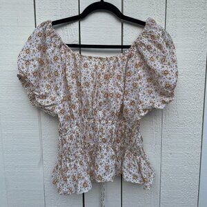 Doen Adie Top in Alabaster Countryside Calico. Tie front, tiered, puff sleeves. Dainty orange/red floral pattern.