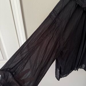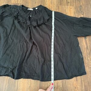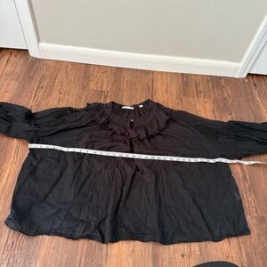 Elegant black blouse with ruffled neckline. Long sleeves with gathered cuffs. Perfect for a chic look. I wore this and washed it once since receiving, photos are still accurate of condition. It was unfortunately just too big on me!