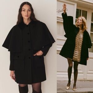 Chic wool coat in a beautiful Italian wool. Velvet covered buttons and collar, removable cape, make this a versatile style.