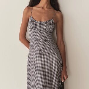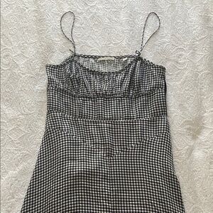 Charming gingham dress with delicate straps. Features a ruffled hem. Perfect for casual outings.