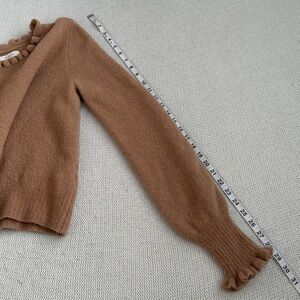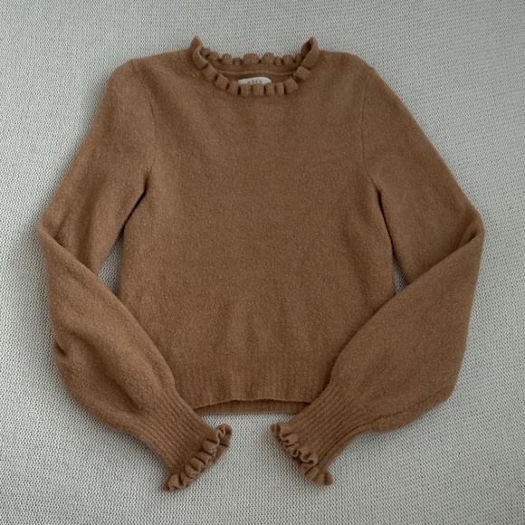 Chic brown sweater with ruffle details. Long sleeves. Soft texture.