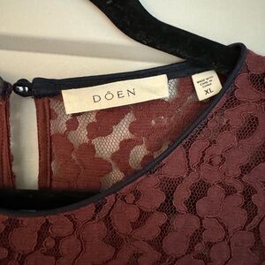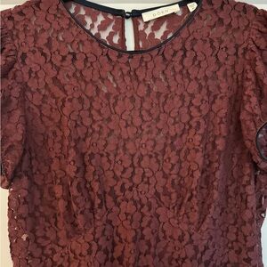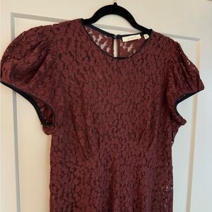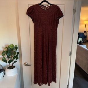 Elegant burgundy lace dress. Features short puff sleeves. Perfect for special occasions.