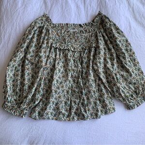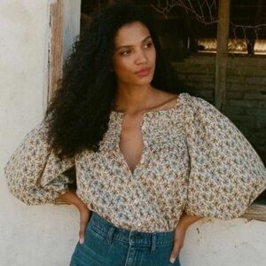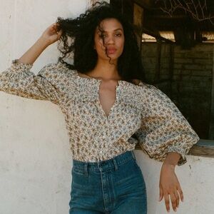 Doen Claudette Cotton Voile Ruffle Long Sleeve Blouse Top Crème Fleurs D’avignon