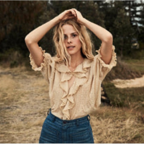 Chic blouse with ruffle details. Soft cream color. Ideal for versatile styling.