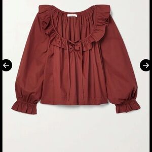 DÔEN's 'Jules' top is designed with feminine details like the ruffles along the neckline and cuffs. It's made from claret cotton-poplin that's gathered to enhance the loose shape and has billowy sleeves and adjustable front ties - fasten them into a delicate bow or leave them loose.