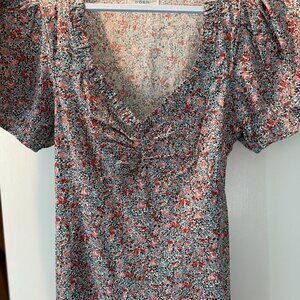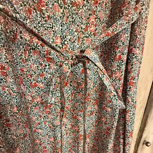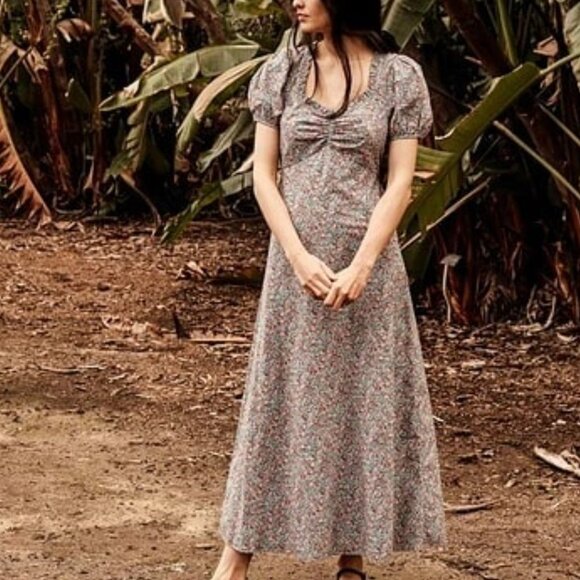 Super hard to find print. The most delicate, flattering, maxi-dress with a sweetheart neckline. trimmed with a small flat ruffle, a counterpoint to the full puff sleeves. shirring at the bust adds dimension to the empire waist while an attached belt ties in a bow in the back to define the natural waist.