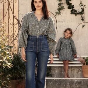 Chic floral blouse by Doen. Features a blue and white pattern. Perfect for casual outings.