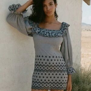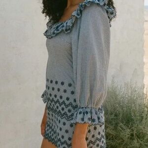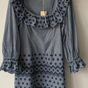 Doen Franique Cotton Ruffle Eyelet Long Sleeve Dress Azure Paris Gingham