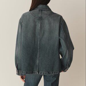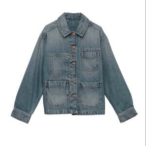 Classic denim jacket. Features button closure. Front pockets for style and function.