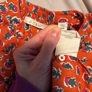 The DÔEN Jane Blouse is inspired by our favorite muse, Jane Birkin. The drapey, billowy shape pays homage to the poetic, artistic spirit of the 1960s Laurel Canyon artist, while a line of natural mother of pearl buttons down the front lends an understated sexiness. A new print blooming with buds on a tangerine background adds vibrancy to this easy closet staple you’ll return to again and again.