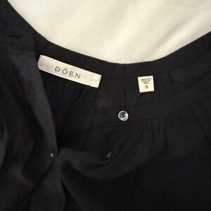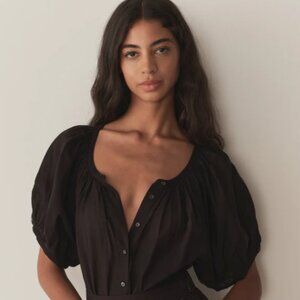 Crafted from a lightweight blend of organic cotton and viscose, the June Top is a short-sleeved take on our beloved Jane Blouse. It features a gathered scoop neckline, full raglan sleeves, and a relaxed, breezy cut. A line of mother-of-pearl buttons extends down the center front. Wear it loose, or tuck it into your favorite high-waisted jeans or shorts.
