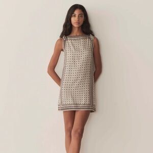 The Doen Cream Sheath Mini Dress is a perfect blend of casual elegance and work-ready style. Featuring a sleeveless design and a classic crew neck, this dress offers a flattering silhouette that is both comfortable and chic. Ideal for a variety of occasions, its cream and brown palette adds a touch of sophistication to your wardrobe.