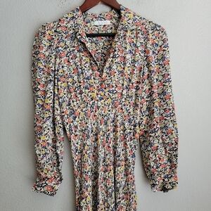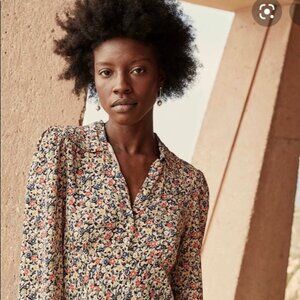 in 100% viscose crepe the Morisot dress highlights its swirling floral print with a simple cut for a big impact. Three self-covered buttons lead to an empire waist while the neckline is accented with a pointed collar. A bias cut skirt and flowing sleeves with button cuffs finish this classic look.