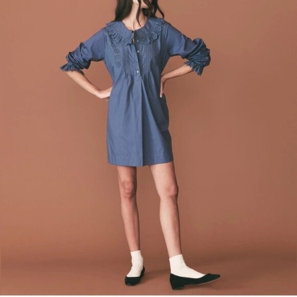 This DÔEN dress in the moody “Atlantic” blue is the perfect blend of vintage romance and timeless simplicity. Crafted from 100% organic cotton, it features delicate eyelet lace at the ruffled collar, bib front, and sleeve cuffs. With its flowy silhouette, pintuck detailing, and button-front design, this prairie-inspired mini is easy to dress up with boots or wear casually with flats.