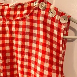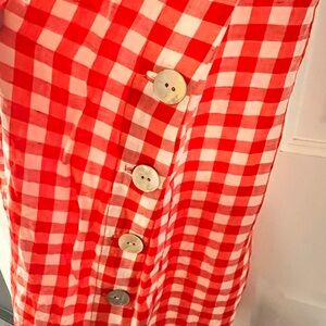 Chic gingham dress by Doen. Features bold red and white pattern with mother of pearl button accent. Size 4.