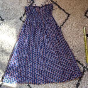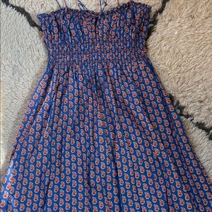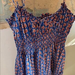 Charming blue dress with orange floral pattern. Features a smocked bodice and ruffled sleeves. Perfect for casual outings. Organic cotton