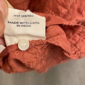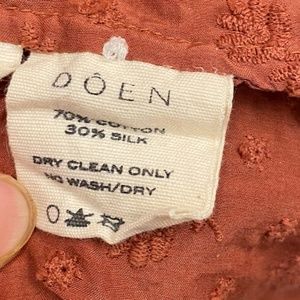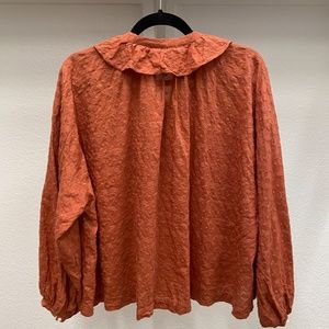 Elegant rust blouse by Doen. Features a ruffled collar and button-down front. Perfect for casual or formal wear.