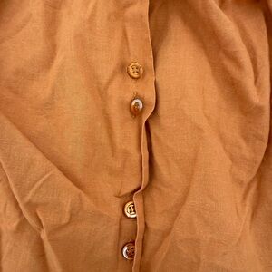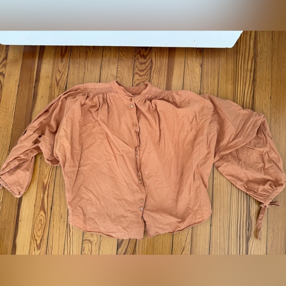 Stylish rust button-up pilgrim blouse. Features long sleeves and a relaxed fit. Note the discoloration on the buttons in the images.