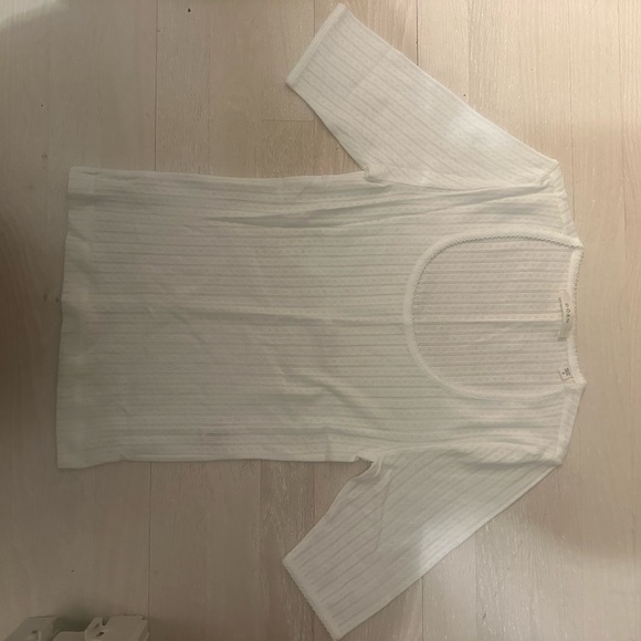 Elegant white ribbed top. Features three-quarter sleeves. Soft and comfortable fabric.