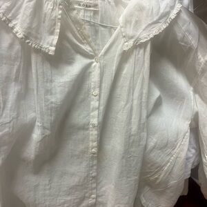Elegant white blouse with ruffled collar. Long sleeves and delicate design. Perfect for a chic look.