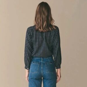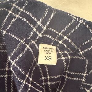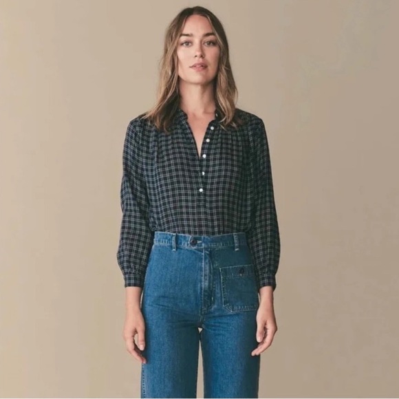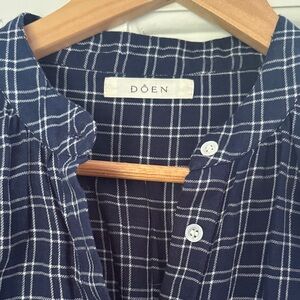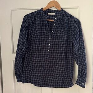 Stylish plaid half button-up shirt with long sleeves.