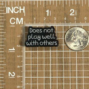 It's good to have a warning label! This pin states "Does not play well with others" in white enamel on a black metal base.