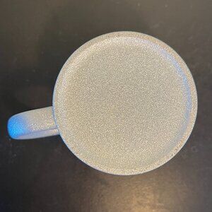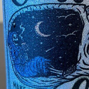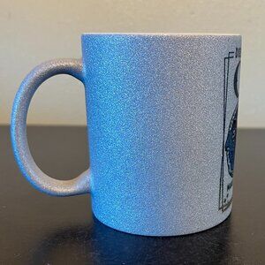 Feeling dead inside, emotionally drained or apathetic, but still functional and energized by the effects of caffeine. Silver glitter surfaced mug features a large image of a skull that encases an image of a skeleton dressed in a blue hooded robe drinking a steaming cup of coffee under a bat filled evening sky with a crescent moon. Surrounding text reads, Does This Coffee Make Me Look Alive? The metallic silver textured glitter finish covers the entire exterior, including the handle and the underside. White interior. Measures 3.75" tall with a 3" diameter; 5“ across including handle..