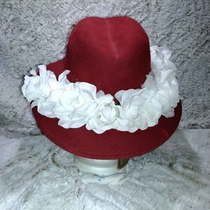 doeskin felt hat. burgundy in color with white flowers. made in USA. some of the flowers may need glued back on in spots ,a couple of them are starting to come loose . I have many vintage hats and other unique items in my closet, bundle and save $$$
