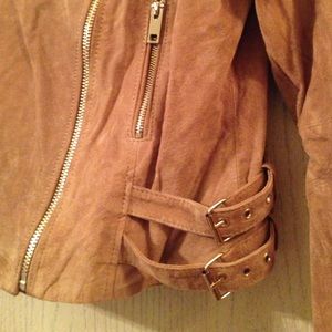 Genuine leather jacket with side buckles and an asymmetrical front zipper.