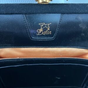 This is a gorgeous Dofan of Paris Vintage Wool Snap Handbag. Only issue is one of the green cobichons is missing but can easily be replaced at a bead shop. Beautiful top gold guilded and Crystal embossed clasp. Rich black wool outer with a 5.5” strap drop. Full silk interior with multiple compartments. No odors. No tears. No stains. 8.75” x 7” x 2”. Made in France