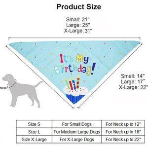 🧿dog birthday bandana is made of soft and lightweight fabric, soft and comfortable to wear. Small Scarf fits necks up to 12'', Large Scarf fits necks up to 16'', X-Large Scarf fits necks up to 22''.