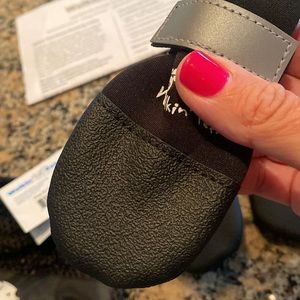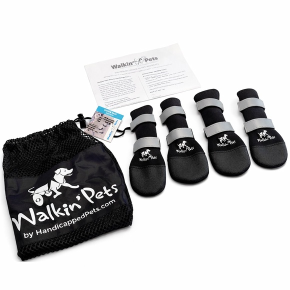 These dog boots by HandicappedPets.com are size small. They fit my 15lb. Shih Tzu but he hates them. LOL. I bought them hoping he’d wear them to stop his back paws from sliding out from under him. He just won’t walk with them on. If you have a dog that is used to dog walking boots, then they’d probably like these. They fit nice with the two well-made velcro fasteners. The rubber isn’t a “sticky” rubber so I’m assuming this type of boot is more for walking on the street/sidewalk. Would be great to keep pet paws from burning on hot pavement.