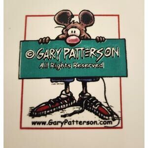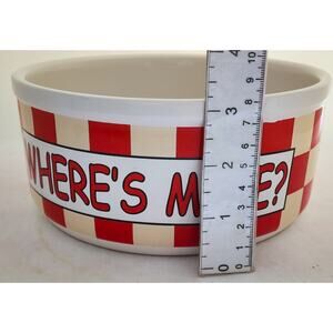 Unique large size dog bowl by artist Gary Patterson. This is a large round bowl. The inside has a cute picture of a dog looking up on a table with a checkered cloth and cute salt & pepper shakers. It is a cute whimsical drawing. The outside is a red and cream color check. On the front side it says "Where's Mine?". Nice large ceramic dog bowl that is 7" in diameter and 3.25" high.