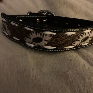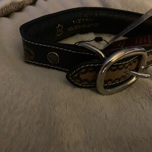 Hand-tooled dog collar by Myra Bag. Features black and brown design. Comfortable and stylish for your pet. Size Medium. NWT