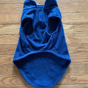 This brand-new, never worn, navy blue, pullover, fleece vest for dogs is a size Large. It features a quarter-length Velcro closure and leash port to easily access your dog's collar.
