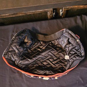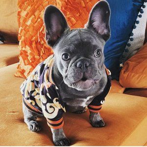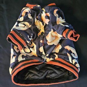 So adorable, designer look dog jacket in navy blue with orange striped cuff detail, front snap closure and yellow/orange 'paisley/scrolled' design.
