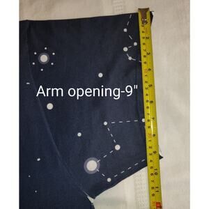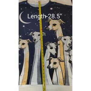 Previously Owned, this is so cute! Has a Jerzees tag and long necked dogs on back and front. With the stars on background. Good weight material(not too light, not too heavy). Background color is Navy Blue. Short Sleeves
