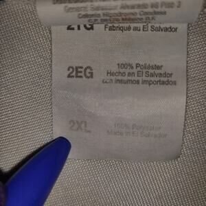 Men's SIZE 2 XL. 100% Polyester. Machine Wash/Tumble Dry. Made in El Salvador.