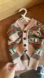 This cozy knit cardigan Doggy outfit features a stylish design with beige, green, and red colors. Perfect for keeping your pup warm and fashionable.