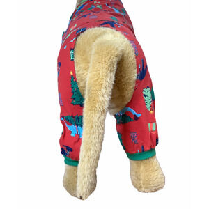 Fabric feels like a stretch t-shirt material. Dinosaur, Christmas, holiday print. Good condition with no holes or stains. NOTE: The stuffed dog modelling the pajamas is a big lab. Please check measurements to ensure it will fit your pup.