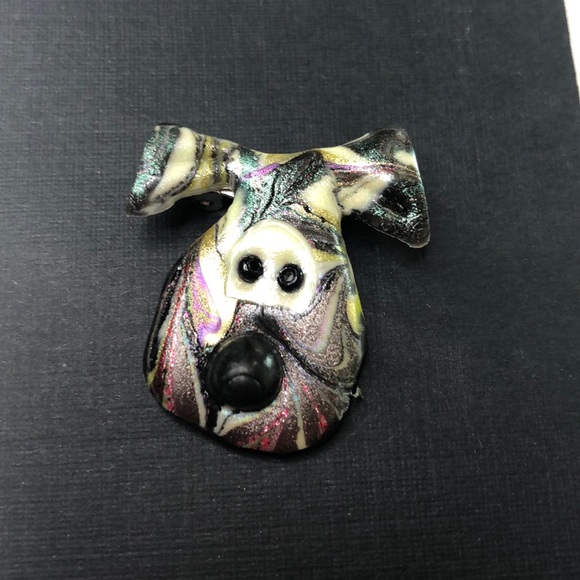 Sweet little dog pin. No markings. 1 1/4” high. Needs home. Multi colored and well behaved.