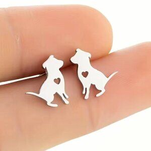 Dog Pitbull and Heart Stainless Steel Stud Earrings #812 (Color: Silver)