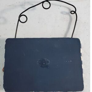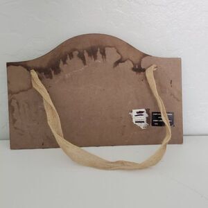 The large plaque measures 11.5" long x 7.5" wide. It is painted in a farmhouse style. The back of the plaque is white and the 3 D top is black with white writing and there is dog prints and white dots, hand painted. The back of the plaque is stained. There is a ribbon that runs through it.