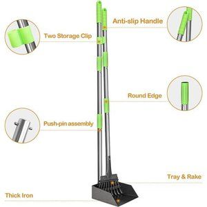 Dog Pooper Scooper Long Handle Stainless Metal Tray and Rake (Green)