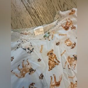 Charming esme set featuring a playful dog print and delicate lace trim. Perfect for cozy nights. Capri pants and long sleeve shirt