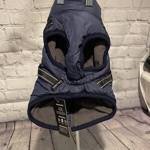 Navy fleece line puffer jacket for small dog harness attached zipper closure