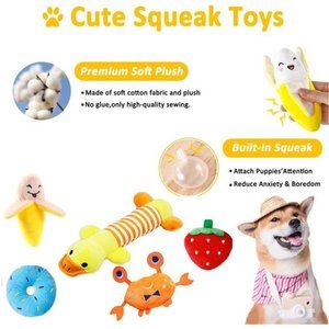 🧿Cute Dog Squeaky Toys: includes Squeaky Dog Toys and 5 Plush Squeaky toys (duck, banana, strawberry and Crab), Dogs like to explore the surrounding environment through sound.